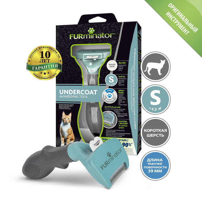 FURminator S qısa tüklü kiçik pişiklər üçün bir vasitədir. Unikal bıçaq ölü astar tüklərini tökülməzdən əvvəl tutur və çıxarır, tökülməni 90%-ə qədər azaldır. Alət vaxtınıza qənaət edir, dərinin və paltonun sağlamlığını qoruyur və qoruyucu saçlara zərər vermir. O, həmçinin pişiyin mədəsində tük toplarının əmələ gəlməsinin qarşısını alır. Döşəmə, paltar və mebelə tökülən saçları unudacaqsınız. Alətin bıçağı qoruyucu tüklərə zərər vermədən nüfuz edir və ölü, boş yapışmış astar tüklərini asanlıqla çıxarır. Skin Guard® qoruyucu kənarları bıçağın dəriyə təzyiqinin qarşısını alır. Darama zamanı rahatlıq üçün əyri bıçaq heyvanın bədəninin konturlarına uyğun gəlir. FURejector® özünü təmizləmə düyməsi saçları alətdən tez atmağa kömək edir, daraq prosesini asanlaşdırır və daha rahat edir. Bıçaq qoruyucu alətin saxlanması zamanı dişləri qorumağa imkan verir. Təlimat: Quru saçlara həftədə 1-2 dəfə 10-20 dəqiqə tətbiq edin. Heyvanı tarayın, aləti saç böyüməsi istiqamətində hərəkət etdirin, bıçağı heyvanın saçına dərindən nüfuz edin. Bir bölgədə uzun müddət qalmayın. Özünü təmizləmə düyməsini basaraq alətdən tükləri çıxarın. FURminator alətinin 10 illik zəmanəti var! Alət ölçüsü: 160 * 58 * 50. İşçi səthin uzunluğu: 39 mm.