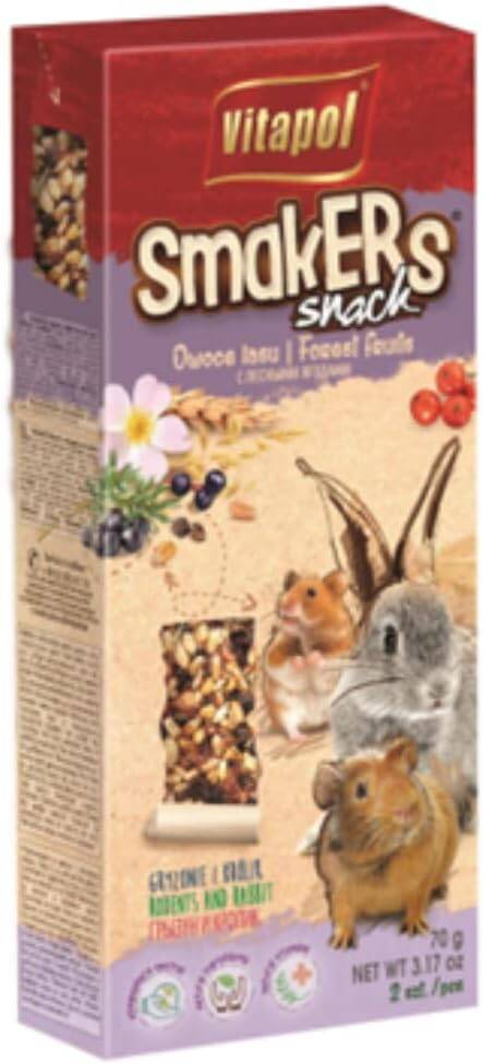 Vitapol Smakers,gəmiricilərin və dovşanların pəhrizini şaxələndirir və əlavə edir. Əsas tərkib giləmeyvəli, yüksək keyfiyyətli qurudulmuş dandelion yarpaqlarıdır. Dandelion A, C və B vitaminləri, kalium, maqnezium, silisium, dəmir, flavonoidlər və karotenoidlərlə zəngindir. Tərkibindəki inulin sayəsində immunitet sistemini dəstəkləyir, xolesterin və qanda qlükoza səviyyəsini aşağı salır. O, həmçinin sidikqovucu xüsusiyyətlərə malikdir, orqanizmi zərərsizləşdirir. Bundan əlavə, Smakers həzm proseslərini tənzimləyən kalsiumla zəngin qatıq damcıları və kətan toxumu ilə zənginləşdirilmişdir.